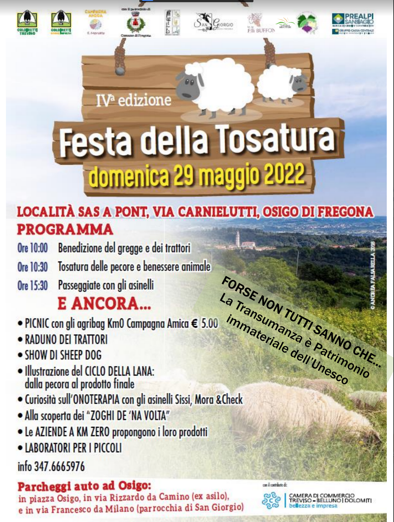 Torna la Festa della Tosatura! L’appuntamento è per domenica 29 maggio in località Sas a Pont a Osigo di Fregona presso le aziende agricole Fratelli Buffoni e Reghét. Ad organizzare la IV edizione dell’iniziativa è Katy Mastorci presidente di Donne Impresa Coldiretti Treviso. Ricco il programma a partire dalle ore 10 con la benedizione del gregge e dei trattori. A seguire grandi e piccini potranno assistere alla tosatura delle pecore e seguire delle vere relazioni sul ciclo della lana. Non mancheranno le imprese agricole a km zero con la proposta dei loro prodotti e nemmeno la possibilità di giocare con i Zoghi de na volta. Raduno dei trattori, laboratori per i piccoli e pic nic di Campagna Amica impreziosiranno la giornata. Tra le novità anche l’onoterapia con gli asinelli Sissi, Mora e Check e alle 15,30 proprio la passeggiate con loro. La manifestazione è patrocinata da Campagna Amica Coldiretti Treviso con il sostegno di Camera di commercio di Treviso e Belluno e dalla Banca Prealpi San Biagio.