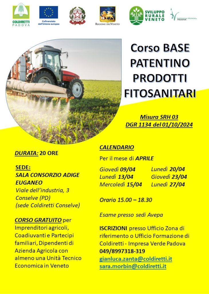 Impresa Verde Padova informa che sono aperte le iscrizioni per il corso BASE per il Patentino Fitosanitario (Acquisto), in programma per il mese di aprile presso la sede di Conselve. L'attività è interamente finanziata dal CSR Veneto 2023/2027 (DGR 1134 del 01.10.2024) ed è quindi gratuita per titolari, coadiuvanti, partecipi familiari e dipendenti di aziende agricole con unità tecnico-economica in Veneto.