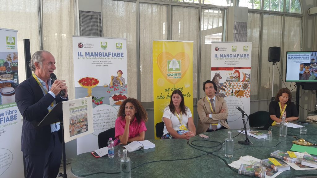 Alla presentazione del libro “Il Mangiafiabe” organizzato dall’Osservatorio Agromafie di Coldiretti con Donne Impresa è intervenuto a sorpresa anche il Presidente della Regione Veneto Luca Zaia per sottolineare come il cibo sia elemento chiave di tante storie e considerato il patrimonio agroalimentare regionale i racconti veneti sono anche di alta qualità. Dall’inizio dell’umanità: dal pomo dell’Eden colto da Eva ed offerto ad Adamo alla manna del deserto e il vino alle nozze di Cana, per arrivare alle favole, con ad esempio il cestino per la nonna di Cappuccetto Rosso e la casetta di marzapane di Hansel e Gretel ed ancora filastrocche e racconti ispirati a prodotti come il Re di Fava, Cecio e Prezzemolina. Questi ultimi, in particolare, fanno parte della raccolta di novelle curata da Bianca Lazzaro nel volume oggi al centro del convegno tenutosi a Venezia nei Giardini Reali di San Marco dall’Osservatorio Agromafie con Donne Impresa Coldiretti Veneto. L’appuntamento, salutato dalla Presidente di Venice Gardens Foundation Adele Re Rebaudengo e dall’Assessore alla Mobilità e Trasporti Renato Boraso è stato introdotto dal direttore di Coldiretti Veneto Marina Montedoro che ha precisato la bellezza del luogo riaperto nel 2019 il cui restauro è stato premiato a livello europeo. Il volume corredato da illustrazioni di Lucia Scuderi e pubblicato da Donzelli Editori percorre la tradizione popolare da Nord a Sud d’Italia attraverso una ricerca narrativa meticolosa e tradotta dai dialetti locali in molti casi. Un patrimonio culturale che grazie al linguaggio semplice esprime tutti i contenuti agroalimentari regionali, i mestieri, le credenze, i detti e proverbi tramandati dalle generazioni dei campi. “La pratica contadina e la vita in campagna sono alla base del modo di vivere e di pensare dell’uomo occidentale. Dai Greci ai Romani – scrive il Procuratore Giancarlo Caselli nella prefazione – sono stati realizzati poemi memorabili dedicati all’agricoltura. Questa opera intende esaltare le radici di una civiltà che continua ad operare in stretta connessione tra natura e cultura”. La lettura dal vivo di alcuni passi a cura dell’attrice Tiziana De Masi ha sottolineato i temi legati all’educazione alimentare dei bambini. “Fame e miseria condite sempre da furbizia – ha spiegato il giornalista Nunzio Primavera autori di numerosi saggi - vanno interpretati come insegnamento ai più piccoli affinchè superino quella che Freud chiama la fase orale. Ora i modelli pedagogici filtrano usi e costumi: nell’era dei social, rispetto alla minaccia di “andare a letto senza cena”, funziona meglio il divieto dell’ uso dell’Iphone. Ma non si deve dimenticare che in un vicino passato la società usciva affamata dalle guerre del secolo scorso”. Marcello Maria Fracanzani Consigliere della Corte di Cassazione e componenti del Comitato Scientifico dell’Osservatorio nella sua relazione ha evidenziato il tratto femminile che traspare proprio in copertina dove è ritratta una donna che prepara da mangiare.