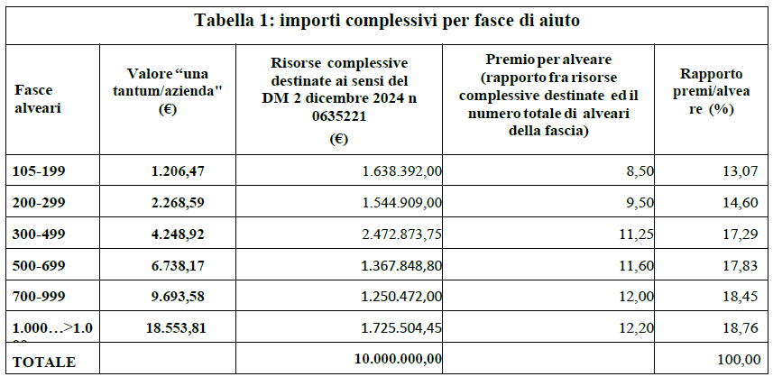 si tratta di un aiuto una tantum determinato sulla base del numero di alveari detenuti alla data del 31 dicembre 2023 e sulla base dell’appartenenza del richiedente ad una delle fasce di seguito riportate: