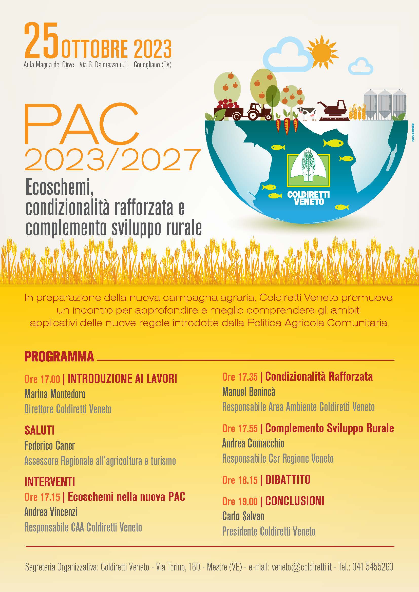 Si terrà IL 25 ottobre alle ore 17.00 in provincia di Treviso, più esattamente a Conegliano presso Aula Magna del Cirve, il secondo dei tre incontri organizzati su territorio regionale da Coldiretti Veneto e dedicati alle novità introdotte dalla Politica Agricola Comunitaria 2023/2027. In preparazione della nuova campagna agraria Coldiretti Veneto incontra gli imprenditori agricoli insieme all’Assessore all’agricoltura e turismo Federico Caner per approfondire gli ambiti applicativi delle nuove regole previste dalla Pac per il prossimo quinquennio. Ecoschemi, condizionalità rafforzata e complemento sviluppo rurale saranno i temi trattati dagli esperti che si alterneranno con le relazioni durante la serata: Andrea Vincenzi responsabile Centro Assistenza Agricola, Manuel Benincà Responsabile Area Ambiente entrambi di Coldiretti Veneto e Andrea Comacchio Responsabile Csr Regione del Veneto. L’introduzione ai lavori è a cura di Marina Montedoro Direttore di Coldiretti Veneto mentre le conclusioni saranno affidate a Carlo Salvan Presidente di Coldiretti Veneto. L’ingresso è libero. Tutto nella locandina.